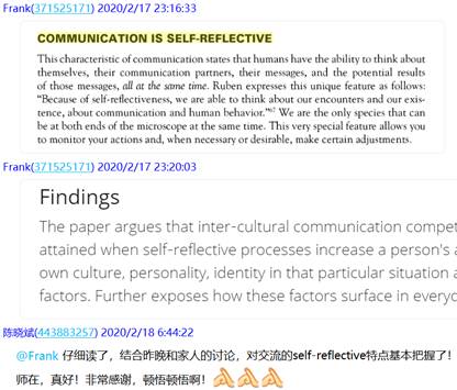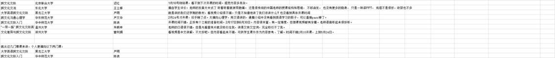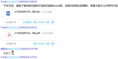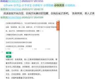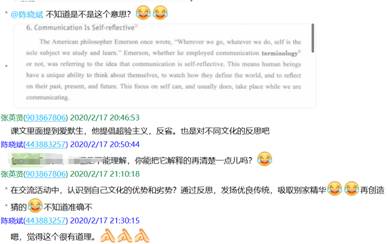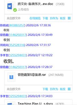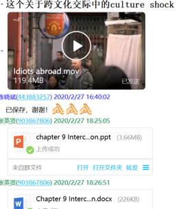 大量的网络资源使我们眼花缭乱,需要补充相应的视频解说、充分利用网上课程平台,为员工补充了MOOC资料《大学英语跨文化交际教程》等。备课组老师针对网课所必需资料的收集、上课可能出现的状况等,多次进行了qq群聊和视频、语音协商等。