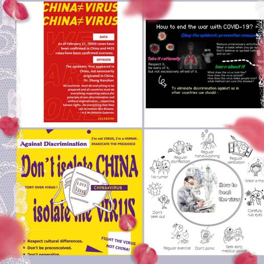 李品老师结合2018级跨文化交际课程其中一章所讲到的偏见和歧视问题,提到疫情初期,许多国家误认为疫情起源中国、及部分国家对中国的“偏见”,要求员工以“抗击疫情,拒绝歧视”为主题,通过制作英文海报对此做出一个官方回应。这一课堂任务不仅调动了同学们语言学习、应用的热情,还大大增强了他们的爱国情怀。同学们以丰富的想象、精心的设计,呈现出了一幅幅形式新颖、内容丰富的海报作品。