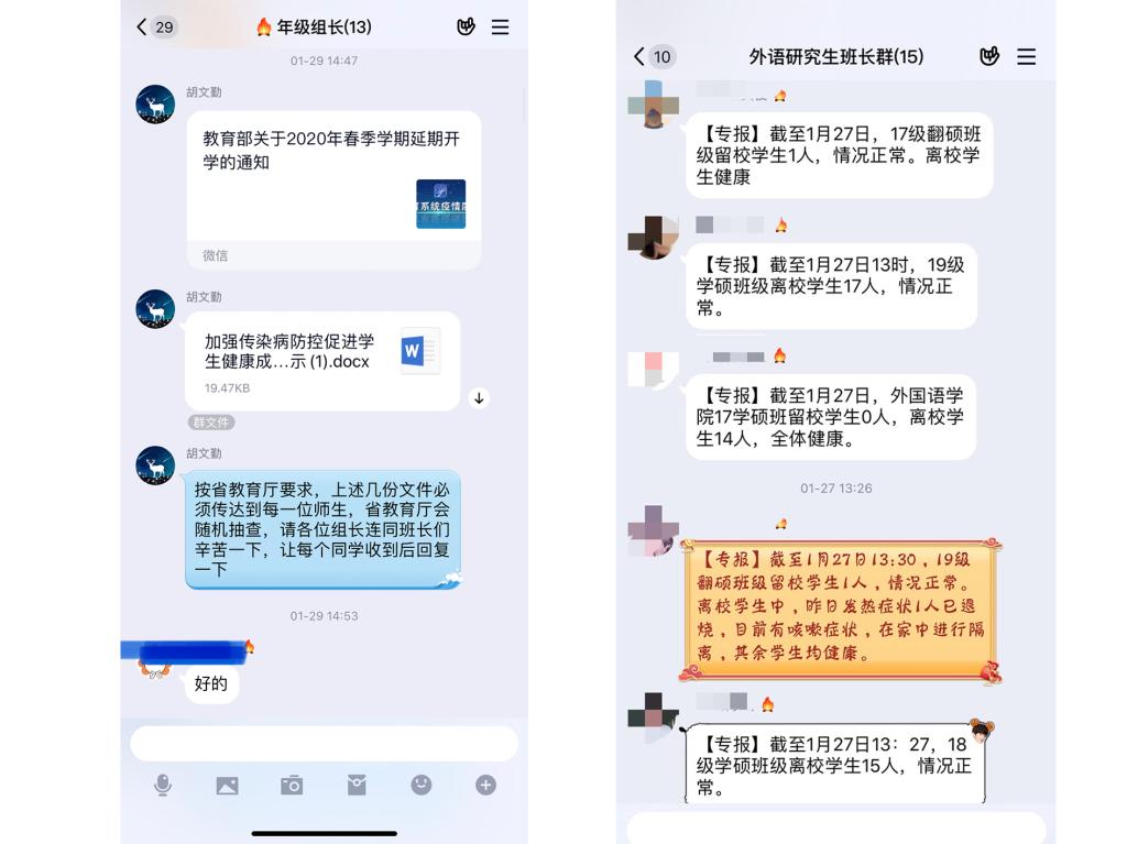 1.落实平安日报制度。1月24日,从一声声“新春快乐,平平安安”开始,beats365开始了同学们每天的平安报告,坚持“零报告”制度,做到本研员工100%全覆盖。与此同时,公司辅导员通过年级群、班长群、学务指导和班主任群、员工党员群、家长群等做好疫情防控的引导宣传工作,时时转发科学防疫注意事项以及相关工作通知。