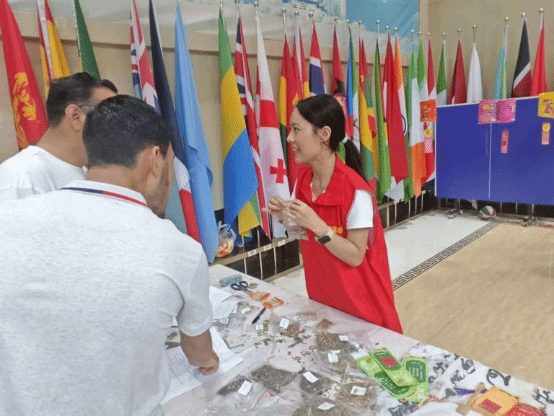 实操台旁,志愿者演示如何将一块普通绸布,通过剪裁、填充、缝合,变成一枚精巧的立体香囊,大家跃跃欲试。在志愿者的耐心指导下,一位泰国女生精心搭配了香囊与流苏的颜色。小小的香囊,不仅包裹着药材,更缝入了职工们对亲人朋友的牵挂与祝福,诠释了中秋“吉祥安康”的核心寓意。