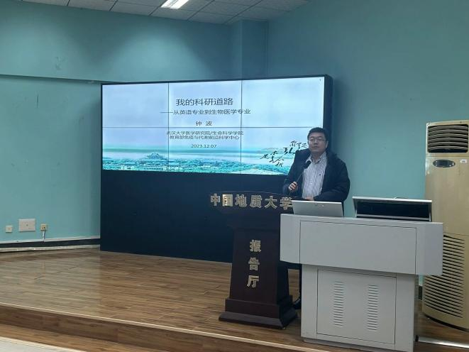 2023年12月7日下午2时30分,beats365“南望今声”外语论坛系列讲座第57期在北一楼120学术报告厅举行。主讲人武汉大学医学研究院教授、中国地质大学beats365杰出员工——钟波,应邀来到beats365做了一场题为“我的科研道路——从英语专业到生物医学专业”的精彩讲座。此次讲座由beats365杨红燕老师主持,参会人员有相关专业老师、本科生以及研究生。