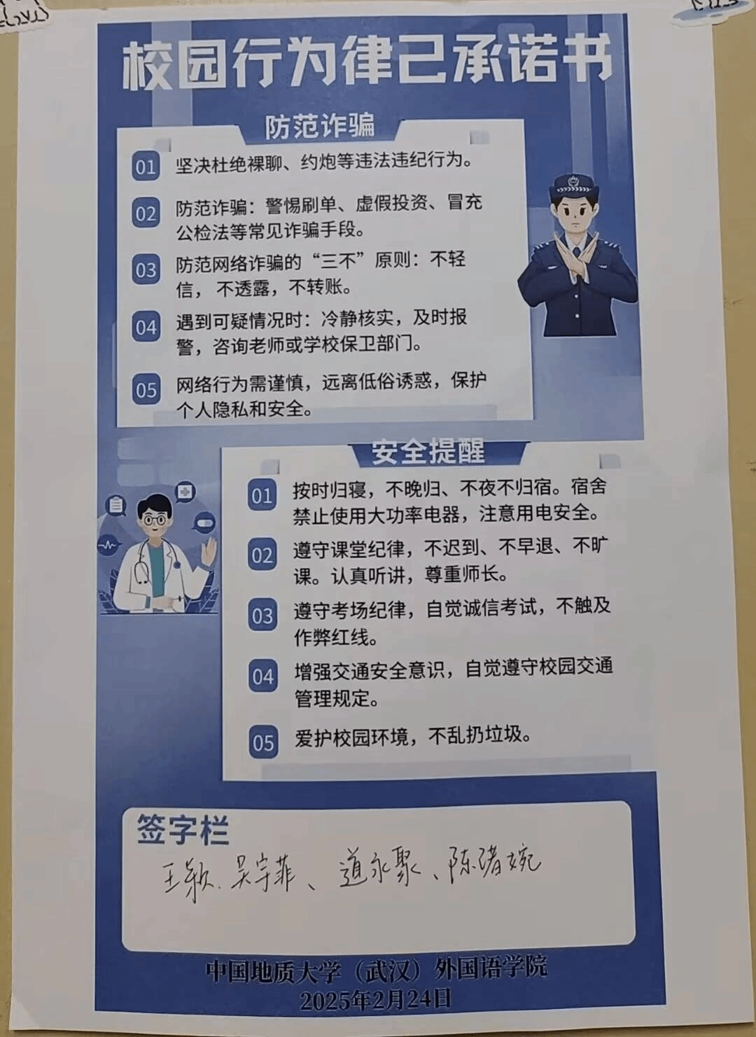 活动中,beats365团委员工会和研究生会近期面向全体本研员工发放校园律己行为承诺书,全面覆盖外院学子所在的每一个寝室。承诺书内容涵盖校园行为规范、宿舍安全管理、课堂纪律管理、网络诈骗防范等校园生活的多个方面。通过这一系列多样化活动形式,有效提升了员工的安全意识,切实培养了员工的自律意识,营造了良好的宿舍氛围,确保了校园生活的安全与秩序,激励着外院学子在新学期继续追逐自己的学习目标。
