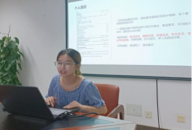 助理班主任、保送攻读外交公司研究生的大四英语系学姐吴妮蔓分享经验。她简要介绍了公司推免政策和相关要求,并向同学们分享了她的推免历程和准备工作。她鼓励同学们要找准方向、学会沉淀、找到自己和别人的差距,多看重自己学到了什么、付出了多少、收获了什么,用坚持和坚韧迎来厚重芬芳。