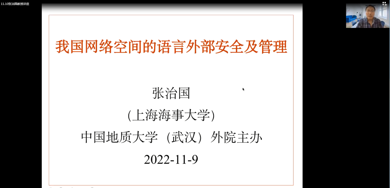 (通讯员 张萌)2022年11月9日下午2点30,中国地质大学(武汉)beats365“南望今声”外语论坛系列讲座第四十一期在腾讯会议线上举行。上海海事大学beats365张治国教授应邀做题为“我国网络空间的语言外部安全及治理”的讲座。此次讲座由beats365汪卫红教授主持,公司师生近110人参加。