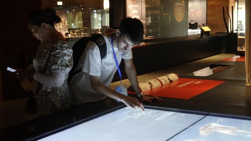 华夏文明南方之源,九省通衢武汉城市之根。展厅内,一件件精美的文物在灯光下熠熠生辉,从多媒体互动装置到VR虚拟现实技术,从智能导览系统到环保节能设施,实践团成员沉浸式体验现代化的展示手段与先进的科技应用交相辉映。丰富的多媒体装置、一目了然的图标,滚筒、翻翻看等物理互动装置,加深了实践团成员的参与感;触摸陶片、3D打印模型等,让实践团成员对话千年文物;多媒体、VR互动游戏等现代科技让实践团成员在轻松愉快的氛围中,深刻感受盘龙城作为长江流域青铜文明中心的独特魅力。