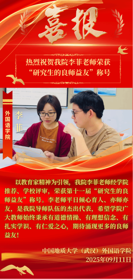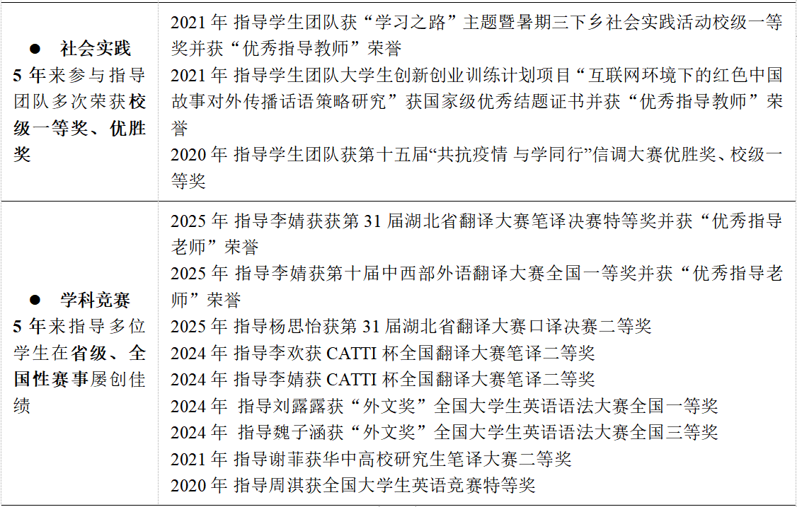 李菲副教授的高尚师德也得到了社会与学术界的广泛认可。她参与的教学团队曾荣获多个教学荣誉和奖项,如2021年荣获“国家级大创项目优秀指导教师”、“暑期社会实践优秀指导教师”和首届教师教学创新大赛湖北省三等奖、2020年荣获外研社“教学之星”大赛英语专业组全国复赛一等奖等荣誉,这些都体现了她对员工全方位成长的支持与帮助。校外,她在知名科研培训中心(山东省国高教育研究有限公司)担任资深学术导师,系统性地开展研究方法专题线上课程教学工作,为来自全国多所高校的研究生及青年教师提供专业指导,显著提升学术素养和科研创新能力,助力学术职业发展。