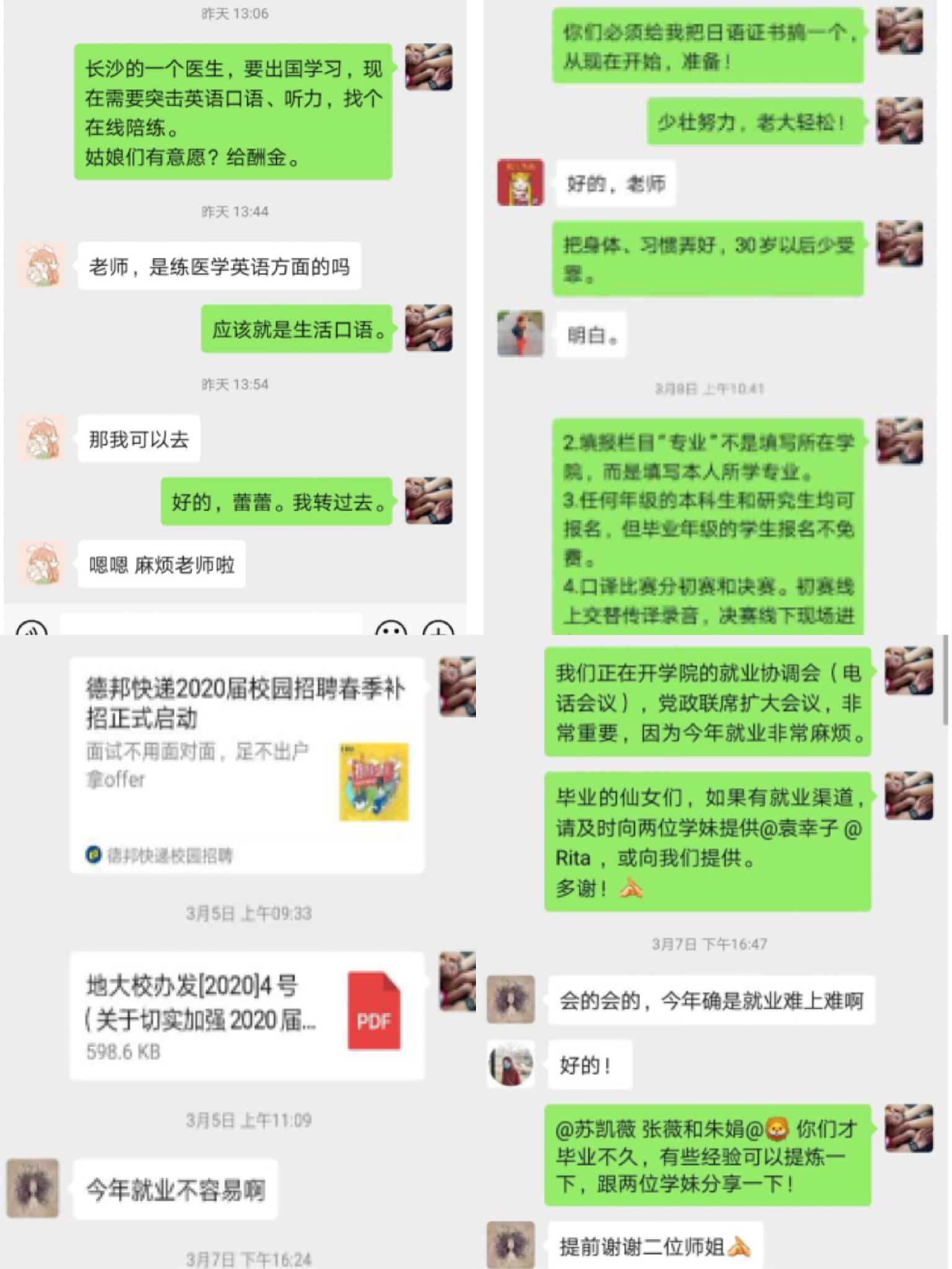 (通讯员 金虹)三月,疫情发展持续向好,但毕业生就业升学的形势依然严峻。面对疫情防控和毕业生就业的双重压力,beats365及时建立与疫情防控相适应的毕业生就业工作机制,号召全体教职员工调动一切资源和力量,深入了解和帮助员工,坚决打赢就业攻坚战。外院研究生导师们积极响应公司、公司号召,对毕业研究生在求职就业和心理疏导方面给予了无微不至的关怀与帮助。在求职就业方面,他们及时了解员工动态,不遗余力帮助员工寻找各类招聘信息和资源,加强求职观念、技能和面试的线上指导;在生活方面,他们在确保员工论文顺利完成的同时,密切关注员工的身体和心理健康。在公司和公司之外,他们是毕业研究生身边最可靠的坚强后盾。